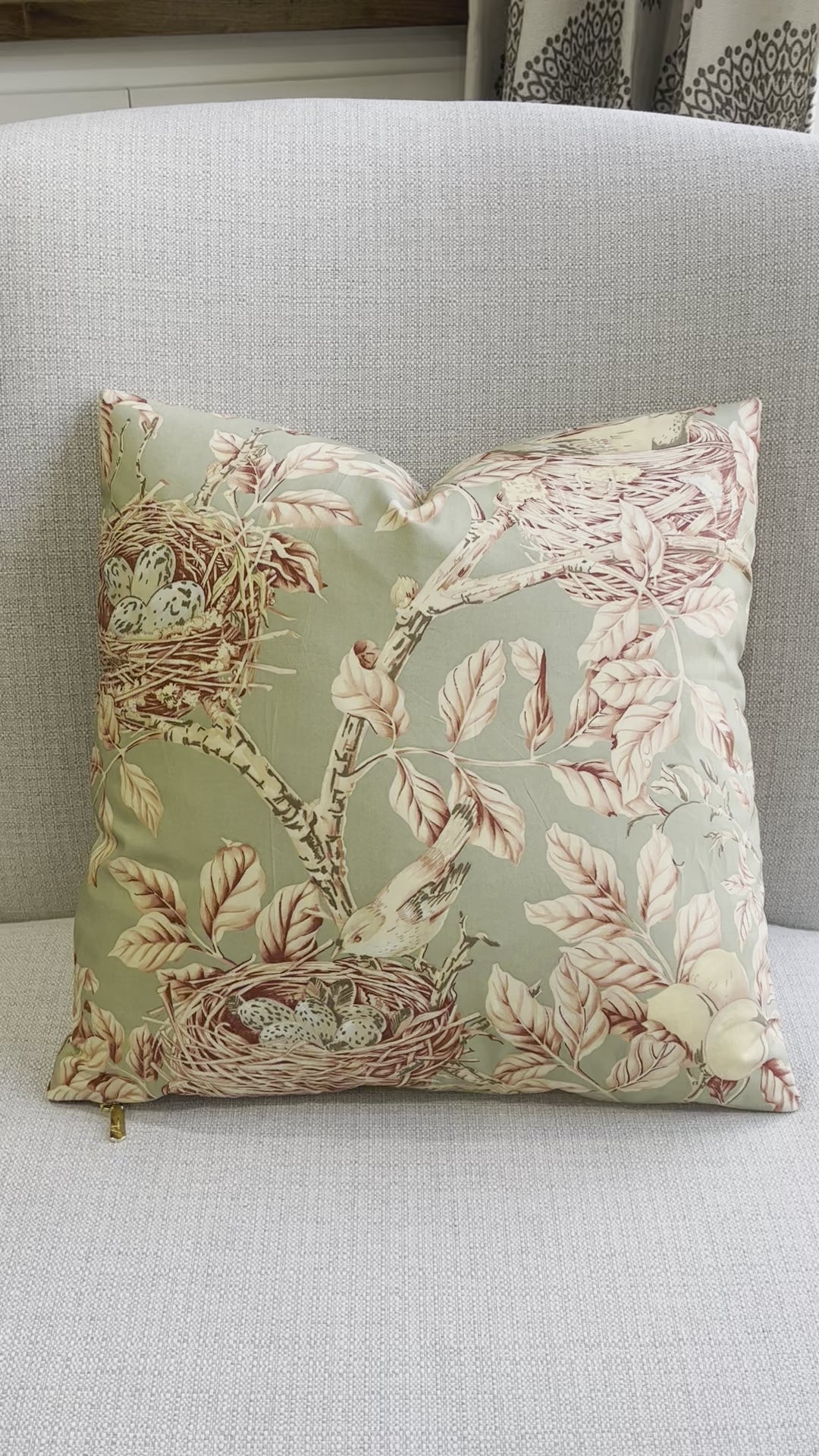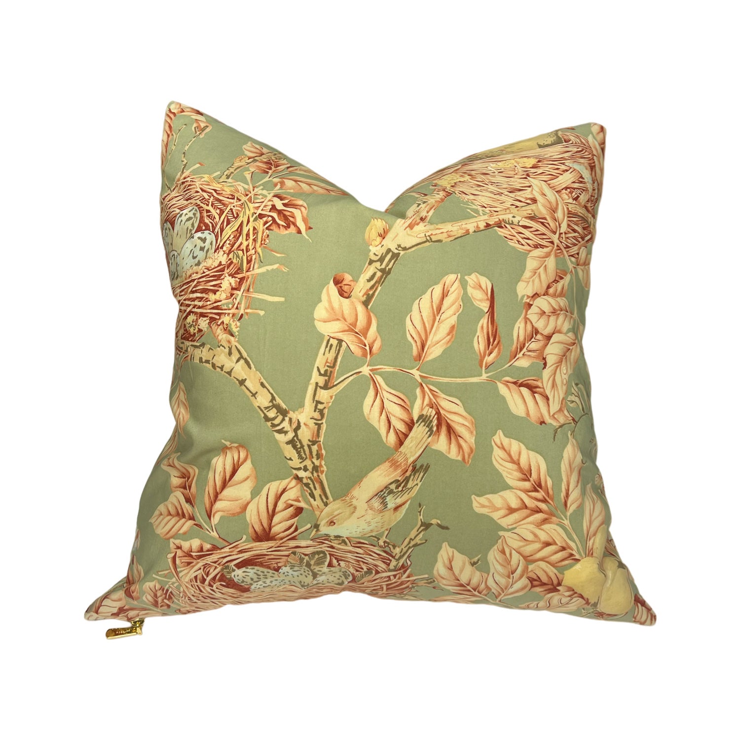 Lovely print of Robins nests on walnut tree in rich warm green and burnt red in gold hue. This vintage fabric is from late 90s by BRUNSWICK & FILIS, Walnut Tree.