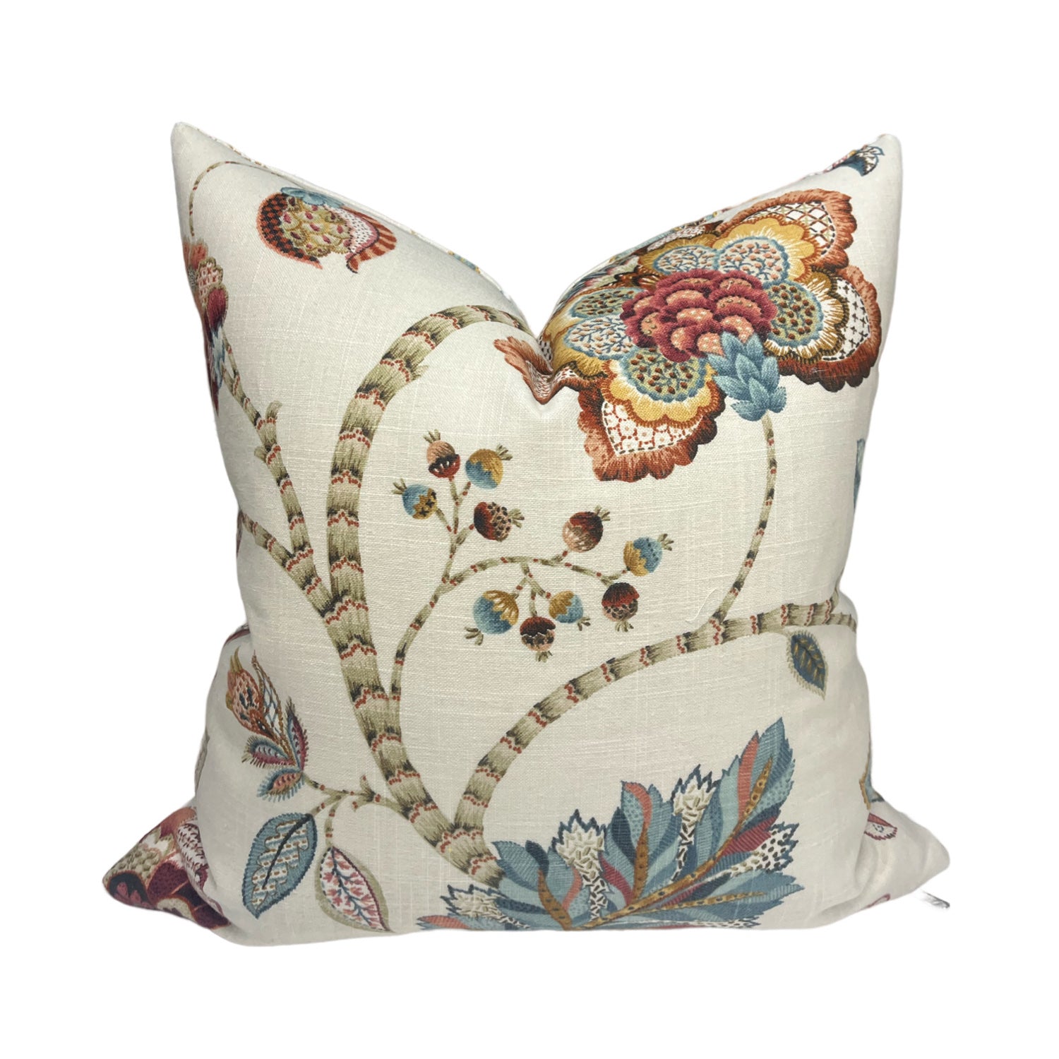 Quality Designer Fabric by PKaufmann. Linen blend floral in earthy colors. Maroon, orange, brown, yellow, aqua, and indigo on cream.