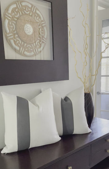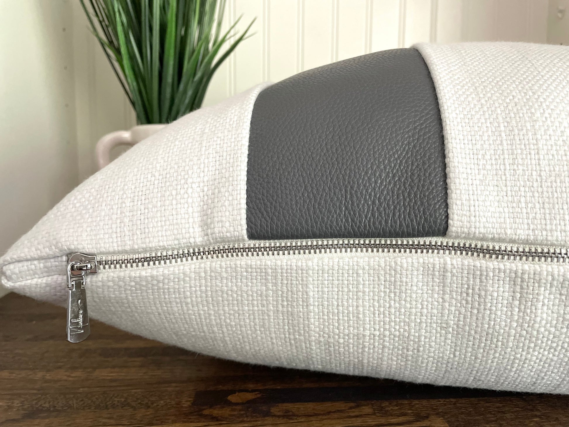 Quality Designer Fabric, Large Basket Weave in Dove White. A bold, 4" band with dark grey genuine leather.