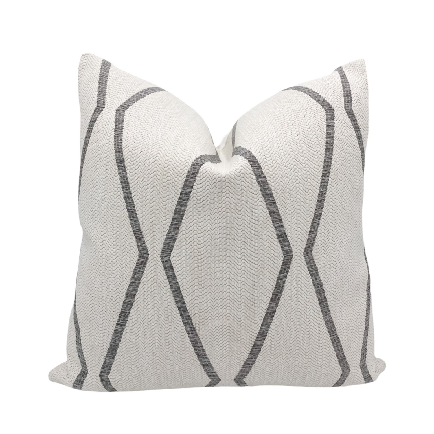 This stunning designer fabric features a contemporary geometric pattern with shades of gray and beige on a white background. 100% Solution-Dyed Polypropylene Indoor/Outdoor Upholstery Fabric.
